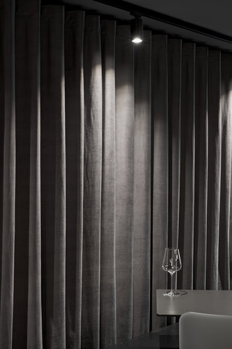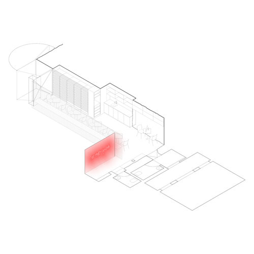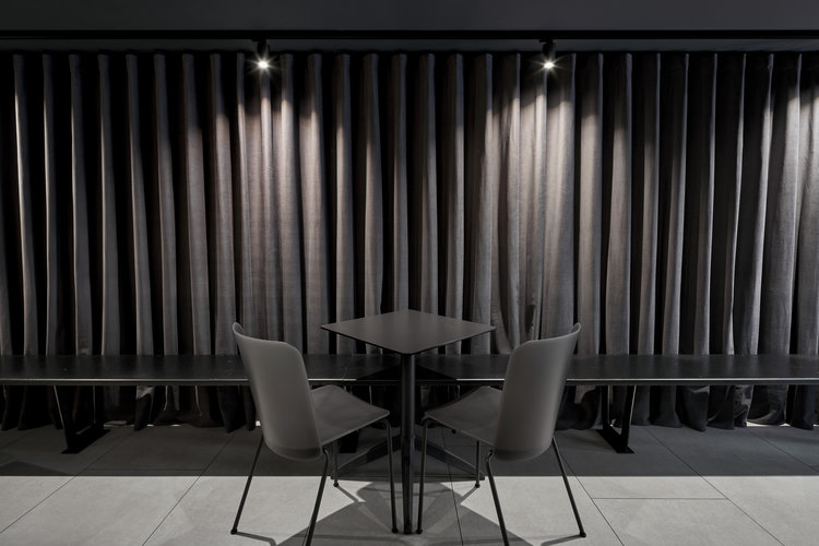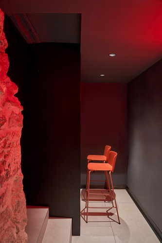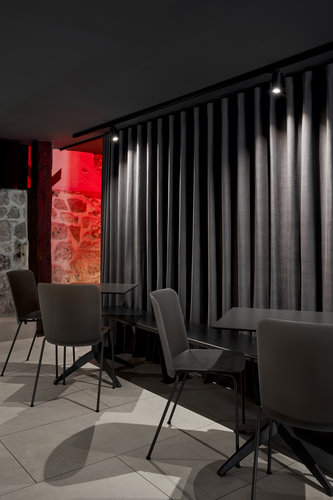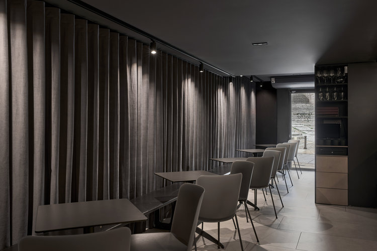 Materialmente se apuesta por los tonos pétreos de los muros medianeros característicos de las construcciones de la zona, su fachada de sillería y un suelo cerámico en la misma paleta cromática. El resto del local busca, a través del acero negro natural, el mobiliario oscuro, y la luz tenue ahondar en la idea de un espacio íntimo, acogedor y casi hogareño. Un interior dominado por esa atmósfera hasta que se cruza la cortina acústica de terciopelo gris donde la zona canalla vibra en tonos rojos gracias al neón que preside el pequeño espacio con el eslogan del negocio.